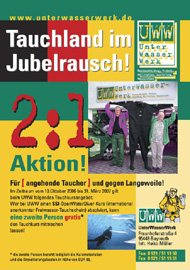 06.10.2006 Eine unglaubliche Aktion erwartet euch bei uns. Wer vom 1. Oktober 2006 bis zum 31. März 2007 einen Anfängerkurs (Open Water Diver) bucht (Gesamtkosten 339 Euro), der kann eine 2. Person seiner Wahl gratis mitnehmen! Es fallen für die 2. Person lediglich die Kosten für die Lehrmaterialien und das Brevet (88 Euro) an. Wann ihr den Kurs dann beginnt oder abschließt, liegt bei euch. Wir haben hierfür ein umfangreiches Programm ganz individuell für euch.