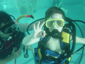 Nun hat er es sich doch getraut. Rechts mein erstgeborener Sohn Rufus mit seinen 6 Jahren. Da ist der Papa aber stolz drauf. Vor ein paar Tagen in den Schulferien ist er von selbst auf uns zugekommen und wollte es einmal versuchen. Jetzt taucht er schon mit uns im Pool wie die Großen (Extra für Kinder bis 10 Jahren: Das Scuba Ranger Programm von SSI).