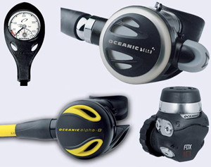 1. Stufe FDX 10 (300 bar) – 2. Stufe Delta 4 – Octopus Alpha 8 – Finimeter