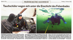 30.01.2007 Das Eistauchen in Pottenstein war für viele ein ganz besonderer Grund einmal zu uns ins Felsenbad zu kommen. Umgeben von interessierten Zuschauern, hat sich das Bad schnell gefüllt. Für so eine Jahreszeit eher unüblich für ein Freibad. Näheres hierzu im Pressebereich...