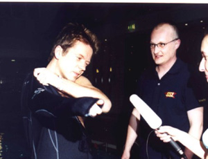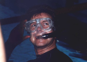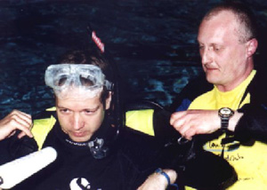 Einstweilen machte sich Heiko fertig und verpasste Christian gleich einmal das vorbereitete Jacket mitsamt der Flasche und dem Atemregler. So..., nun noch das Jäckchen für den Herren. Jana am Beckenrand mit dem Mikrofon wollte nicht baden gehen. Schnell entwich sie Christian, als er sie packen wollte.