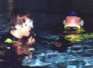 So, jetzt gab es kein zurück mehr. Seine spärlichen Hilferufe durch seinen Schnorchel halfen ihm nichts mehr. Mit einem kräftigen Stoß landetet er im Becken des Stadbades Bayreuth. Nach dieser kurzen Erfrischung musste er erst einmal ein paar Bahnen bei uns ziehen. Oh nein..., Christian..., Achtung..., Taucher und Schwimmer voraus.