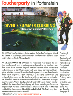 Am 28. Juli 2007 ab 15 Uhr rockt das Felsenbad! Hier zeigen die Taucher aus Bayreuth und Umgebung dass diese nicht nur tauchen, sondern auch feiern können. Begrüßt werden...