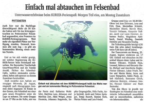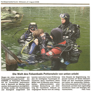 Fasziniert waren am Mittwoch rund drei Dutzend Kinder beim Schnuppertauchen mit dem Unterwasserwerk Bayreuth im Felsenbad in Pottenstein. Für den KURIER-Ferienspaß rückten gleich mehrere erfahrene Taucher an, um den Kindern ein unvergessliches Abenteuer zu ermöglichen. Am kommenden Montag gibt es einen zweiten Schnupperkurs in Sachen Tauchen. Einen ausführlichen Bericht lesen Sie auf Seite 43.