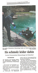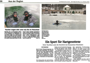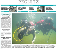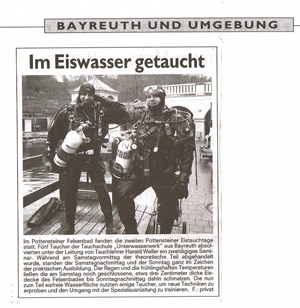 Erstmalig hat im Pottensteiner Felsenbad ein Eistauchkurs stattgefunden. Bei Wassertemperaturen von etwa 4 Grad plus haben sich insgesamt ein Dutzend Kursteilnehmer über Eislöcher unter Wasser begeben. Gefroren haben diese bei ihren 20-minütigen Tauchgängen wohl kaum, berichtete....